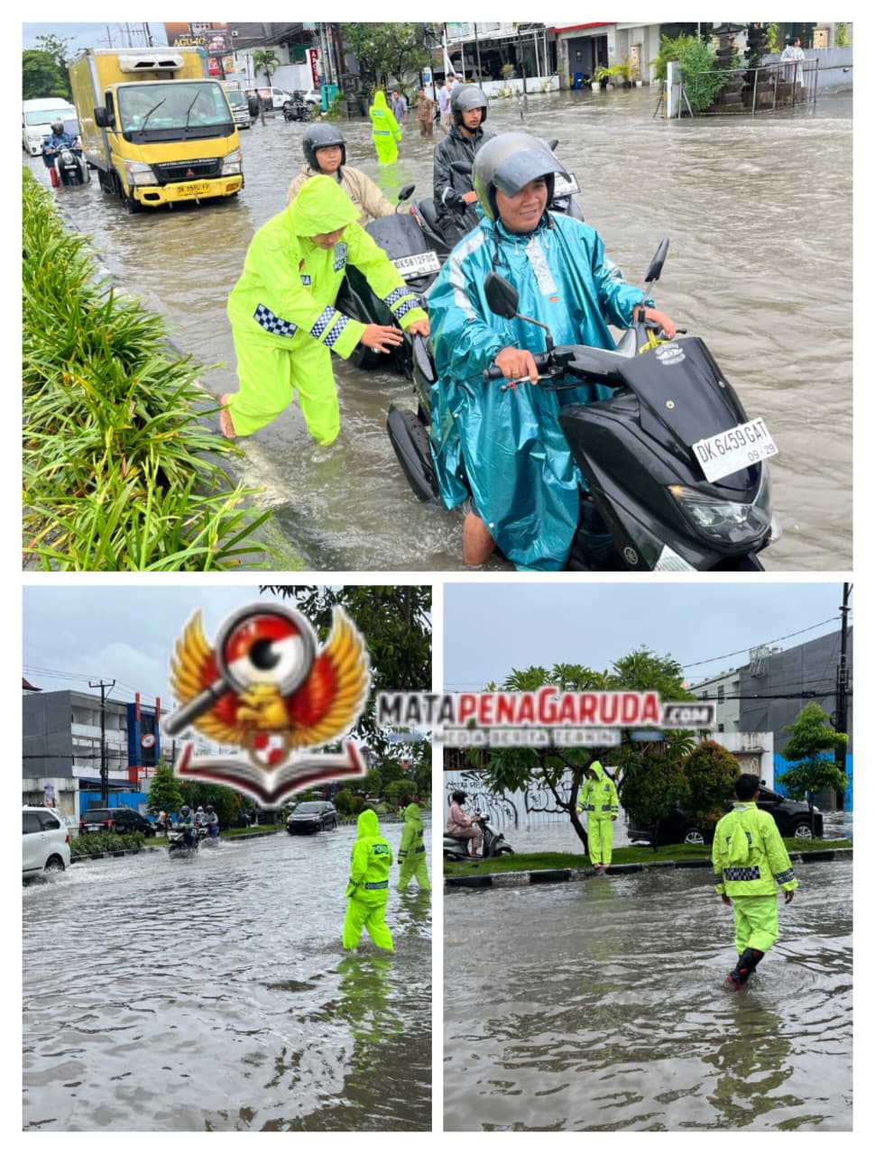 Sigap Tangani Genangan Air, Personel Unit 93 Polresta Denpasar Bantu Pengendara di Jalan Sunset Road