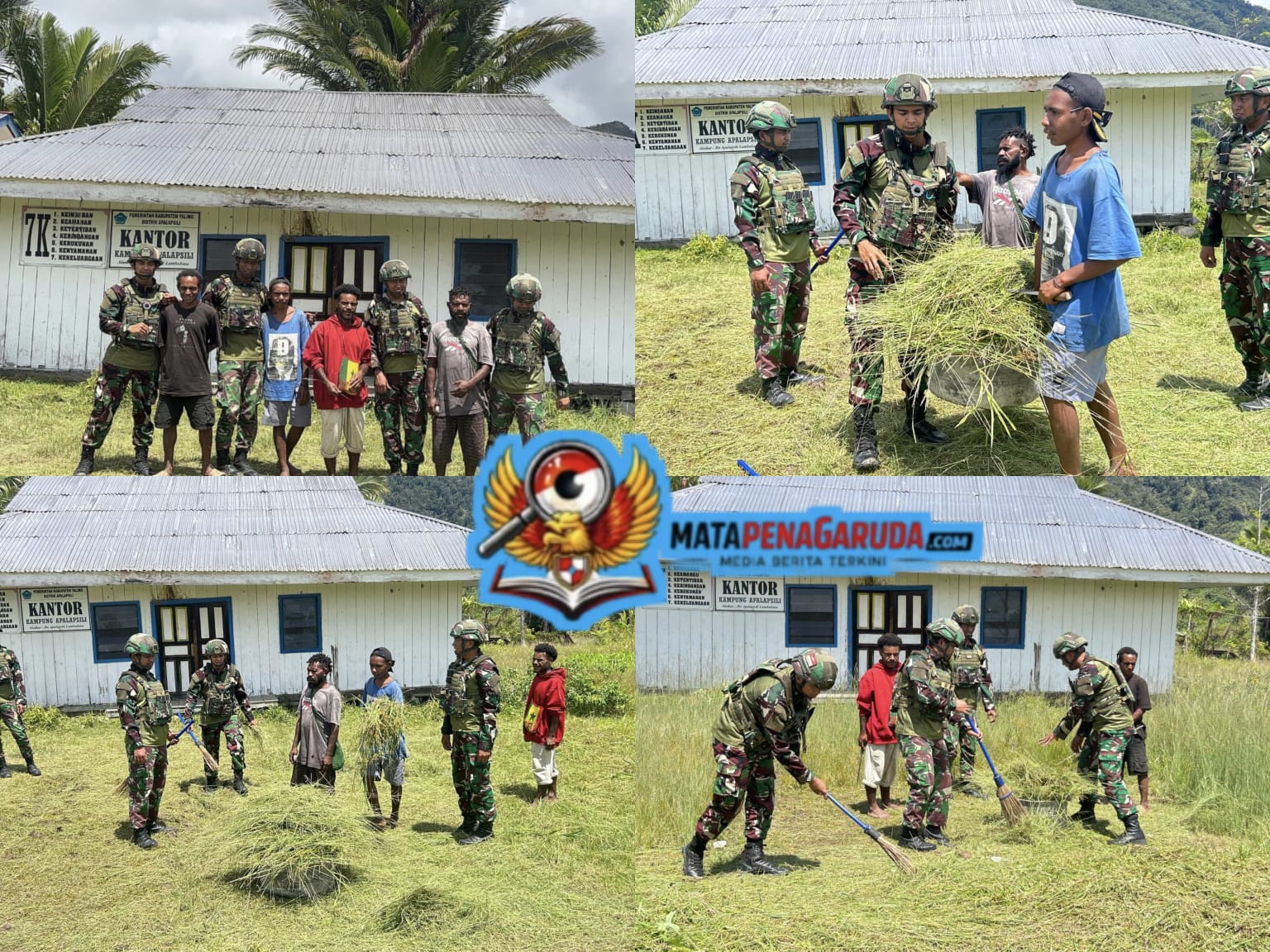 Wujudkan Lingkungan Bersih, Satgas Yonif 521/DY Bersama Warga Gelar Karya Bakti di Area Kantor Desa Apalapsili
