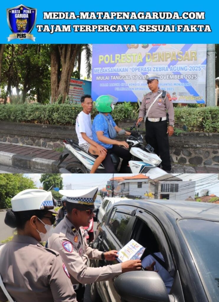Denpasar – Satuan Lalu Lintas Polresta Denpasar melaksanakan Operasi Zebra Agung 2025 di kawasan Traffic Light (TL) Sunset Road, tepatnya di simpang Jl. Imam Bonjol – Jl. Sunset Road, Kuta, Badung, pada Senin (17/11/2025). Kegiatan ini dipimpin oleh KBO Sat Lantas Polresta Denpasar, Ipda Helmi Iskandar, S.H., selaku Kasubsatgas Penegakan Hukum (Dakgar).