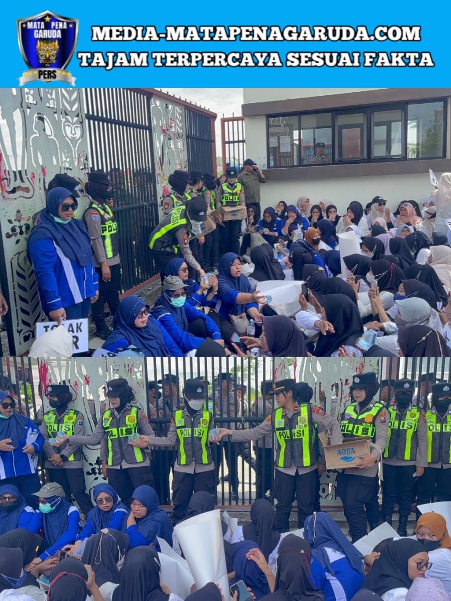 Di tengah kerumunan massa yang menyuarakan aspirasi mereka, tampak sejumlah Polisi Wanita (Polwan) dari Polres Bojonegoro Polda Jatim melakukan aksi simpatik dengan membagikan air mineral kepada para pengunjuk rasa.