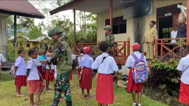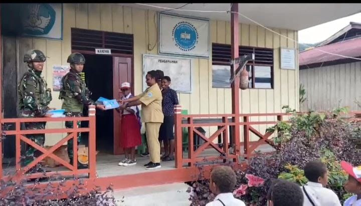 Yalimo, –Sebagai wujud kepedulian terhadap dunia pendidikan di wilayah penugasan, personel Satgas TNI membagikan buku bacaan dan buku tulis kepada siswa sekolah dasar di Distrik Apalapsili, Papua. (13 Oktober 2025).