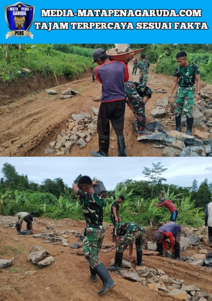 Di bawah terik matahari pagi yang hangat, tampak para prajurit TNI dengan semangat pantang menyerah bekerja bergotong royong bersama masyarakat. Mereka bahu-membahu menata batu kali dan meratakan badan jalan agar hasil pekerjaan nantinya kokoh dan dapat di lalui kendaraan dengan aman serta nyaman. Semangat kebersamaan antara TNI dan warga menjadi pemandangan yang penuh makna, menggambarkan kuatnya sinergi antara aparat pertahanan dengan rakyat dalam mewujudkan pembangunan desa.