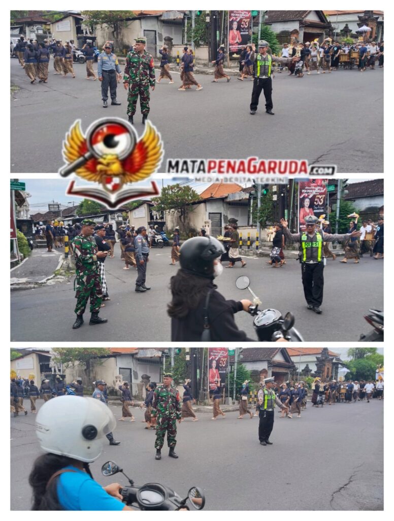 Personel Polsek Dentim bersinergi dengan unsur TNI, Linmas, dan Pecalang setempat guna memastikan kelancaran iring-iringan warga pengusung bade yang melintas di lokasi tersebut.