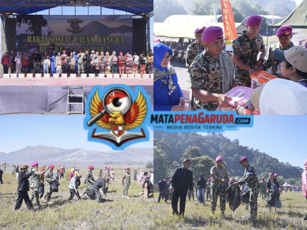 Probolinggo, Jatim —Pasmar 2 Korps Marinir menggelar aksi nyata bakti sosial pembagian sembako, bakti kesehatan pelayanan pengobatan gratis dan bersih-bersih lingkungan dipimpin langsung Komandan Pasmar 2 Mayjen TNI (Mar) Dr. Oni Junianto, S.A.P., M.M., di Lautan Pasir Tengger Bromo Probolinggo. (18/4/2026).