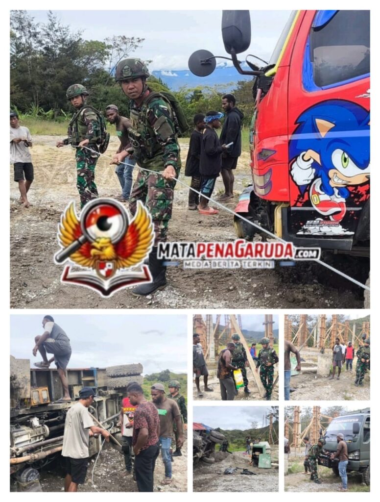 Walesi —Kegiatan Pembinaan Teritorial (Binter) oleh Satgas TNI di Papua aktif membantu evakuasi kendaraan yang mengalami kecelakaan, termasuk truk tergelincir atau terperosok, sebagai bagian dari Bakti TNI untuk membantu kesulitan rakyat dan meningkatkan kemanunggalan TNI-Rakyat.