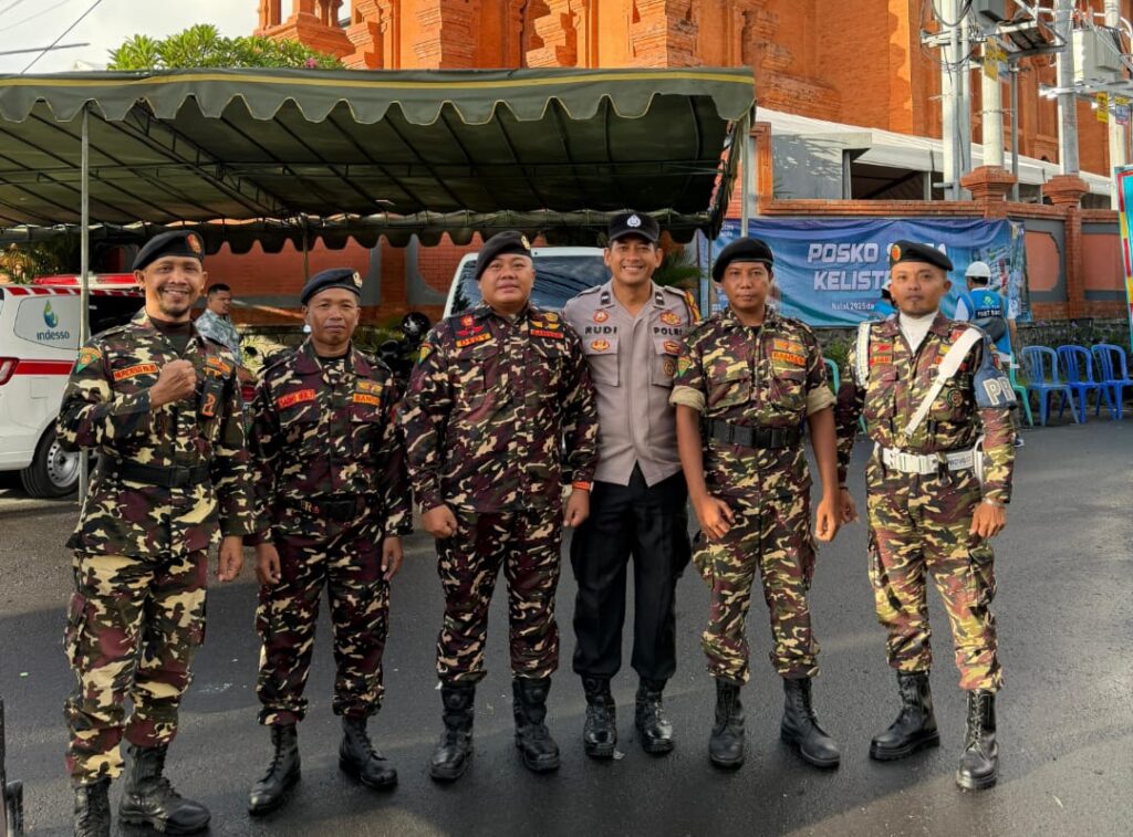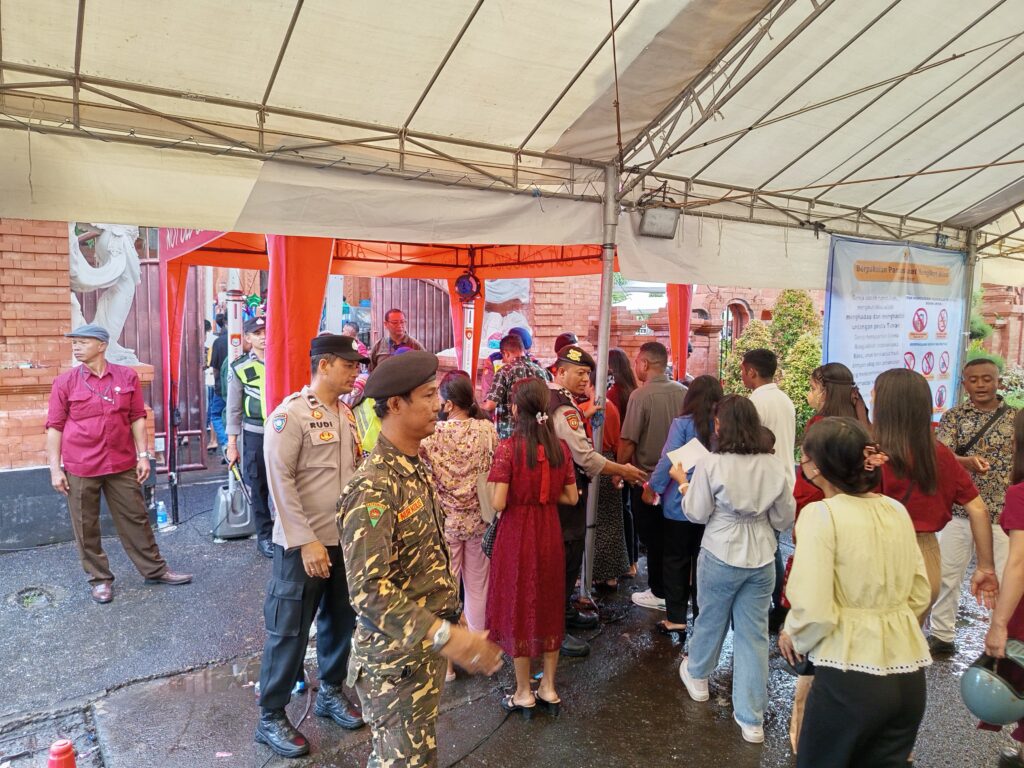 Semangat toleransi dan kebersamaan antarumat beragama tampak nyata dalam pelaksanaan pengamanan ibadah Natal 2025 di Gereja Paroki Roh Kudus Katedral, Jalan Tukad Musi, Denpasar Timur, Kamis (25/12/2025). Kegiatan pengamanan tersebut melibatkan personel Polsek Denpasar Timur (Dentim) yang dibackup Polresta Denpasar, Polda Bali dan unsur TNI, serta mendapat dukungan dari Ormas Banser wilayah Denpasar Timur.