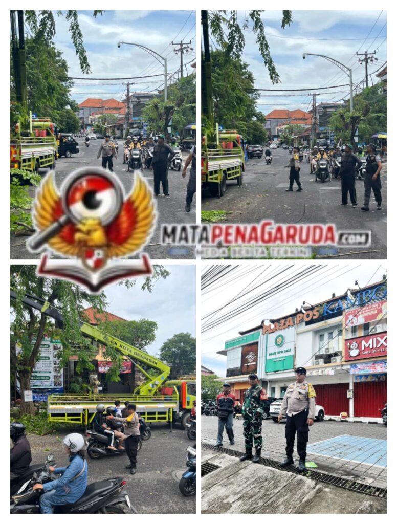 DENPASAR,. Dalam rangka menjaga keamanan dan kelancaran arus lalu lintas, Bhabinkamtibmas Desa Sumerta Kauh Aiptu I Putu Sujana bersama Babinsa dan Linmas melaksanakan pengamanan kegiatan perompesan pohon angsana yang berlokasi di depan Kantor Desa Sumerta Kauh, Jl. Kamboja, Denpasar Timur, pada Sabtu (28/2/2026) pukul 09.00 Wita.