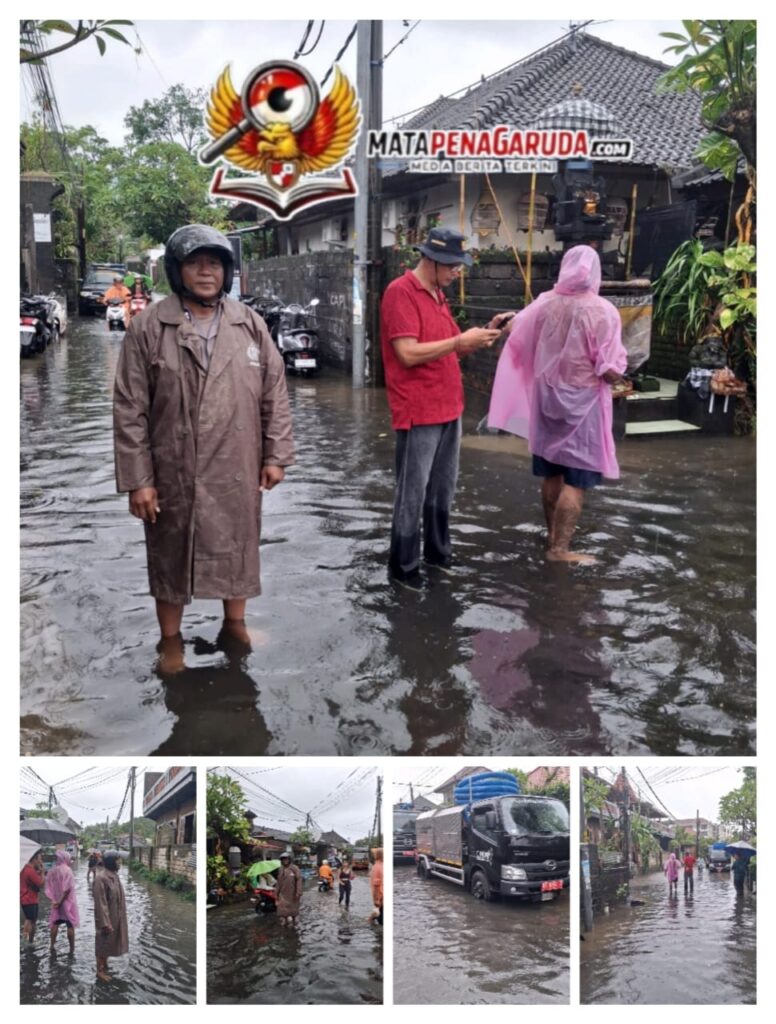 Denpasar – Bhabinkamtibmas Kelurahan Sanur Aiptu I Nyoman Suwasama melaksanakan kegiatan pemantauan wilayah terkait adanya genangan air akibat curah hujan yang cukup tinggi. Selasa (24/2/2026) Kegiatan pemantauan dilakukan di Jalan Bumi Ayu, Lingkungan Batu Jimbar, Kelurahan Sanur, Denpasar Selatan. Berdasarkan hasil pengecekan di lapangan, terpantau genangan air sepanjang Jalan Bumi Ayu dengan ketinggian mencapai sebetis kaki orang dewasa.