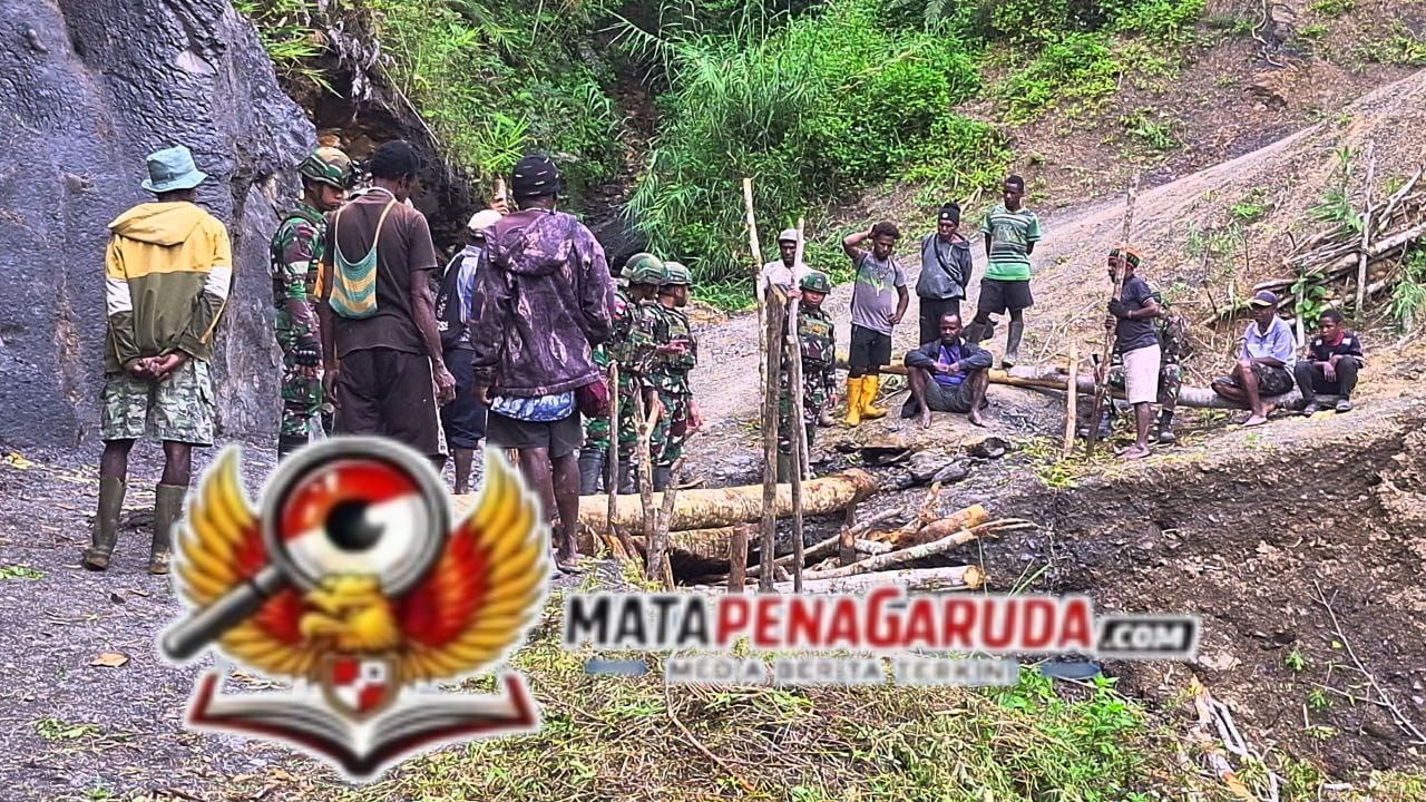 Satgas Pamtas RI-PNG Kewilayahan Papua Pegunungan Yonif 521/DY Pos Eragayam ikut serta membangun jembatan akibat longsor yang mengakibatkan terputusnya jalur perlintasan warga.