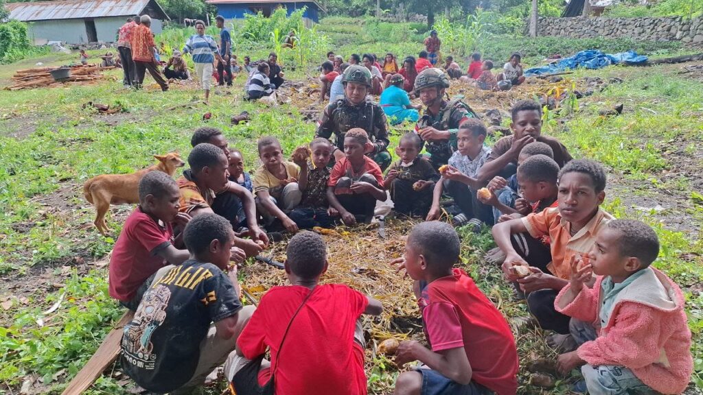 Papua, —Tradisi “Bakar Batu” adalah upacara adat yang sakral dan penting di Papua, Kegiatan ini melibatkan seluruh masyarakat dan di hadiri juga oleh anggota TNI Satgas Yonif 521/DY Pos Kurima, Distrik Kurima Kab. Yahukimo, Papua Pegunungan yang bertugas di wilayah tersebut sebagai bagian dari interaksi sosial dan penghormatan budaya.