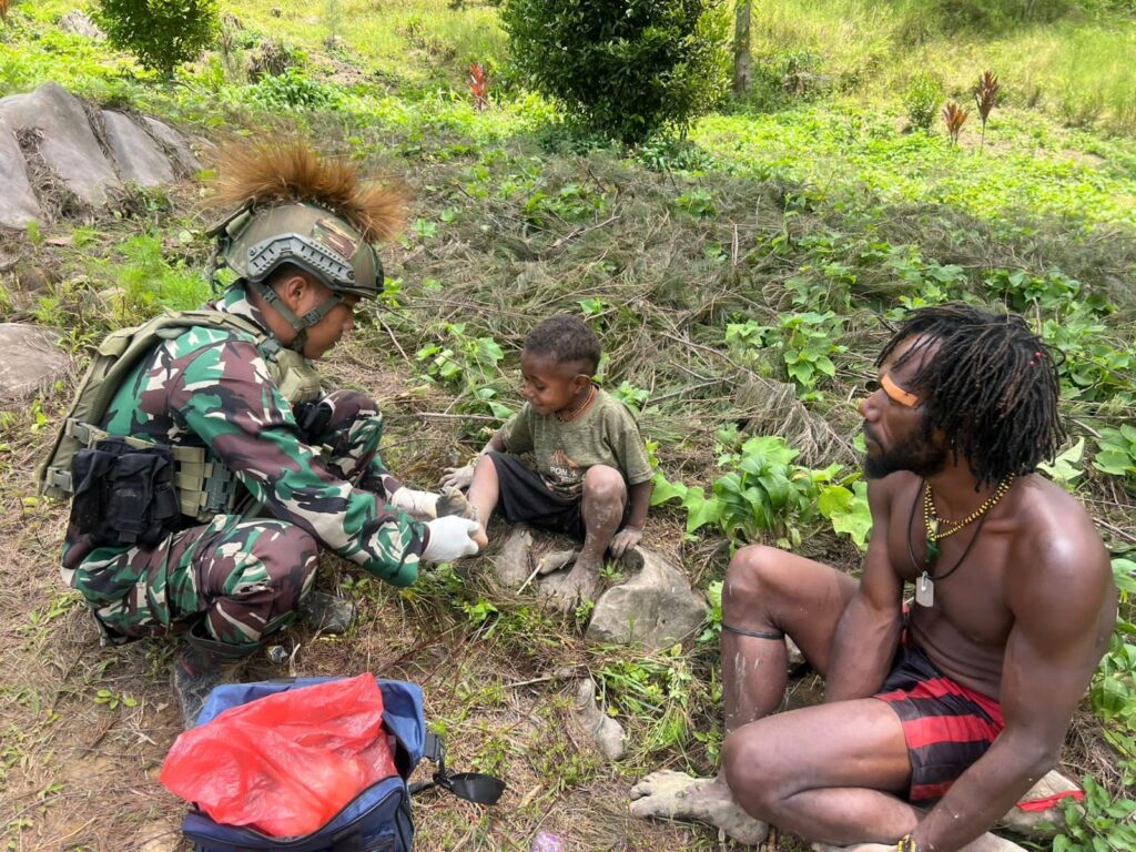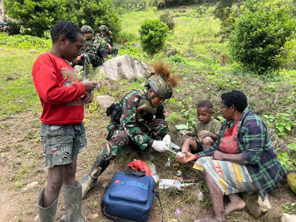 [ ILAGA, PAPUA ] – Di antara pegunungan yang menjulang dan kabut yang sesekali menyapa, denyut nadi kehidupan di Kampung Wuloni, Distrik Ilaga, berdetak pelan. Namun, pada sebuah hari yang cerah, suasana tenang itu disemarakkan oleh kedatangan para penjaga perbatasan, prajurit Satgas Yonif 700/WYC, yang tak hanya membawa senjata, tetapi juga kotak P3K dan hati yang tulus untuk menyembuhkan.