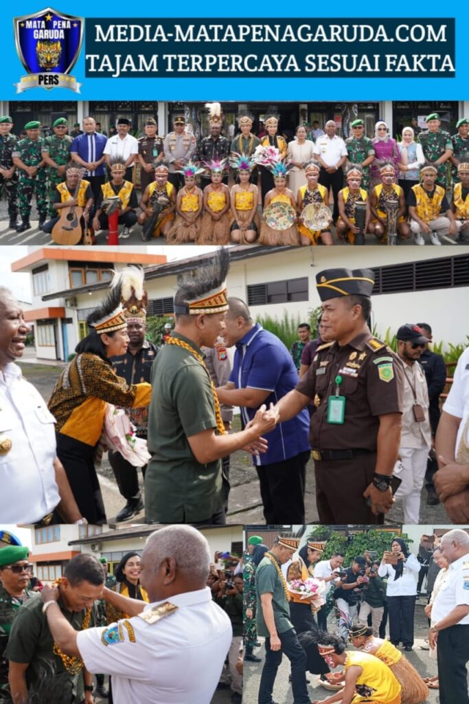Sejak menapakkan kaki di Bandara, Pangdam bersama Ketua Persit KCK Daerah XVIII/Kasuari, Ny. Mevi Christian K. Tehuteru, langsung disambut meriah dengan tarian adat, pengalungan bunga, serta prosesi injak piring sebagai simbol penghormatan dan penerimaan.