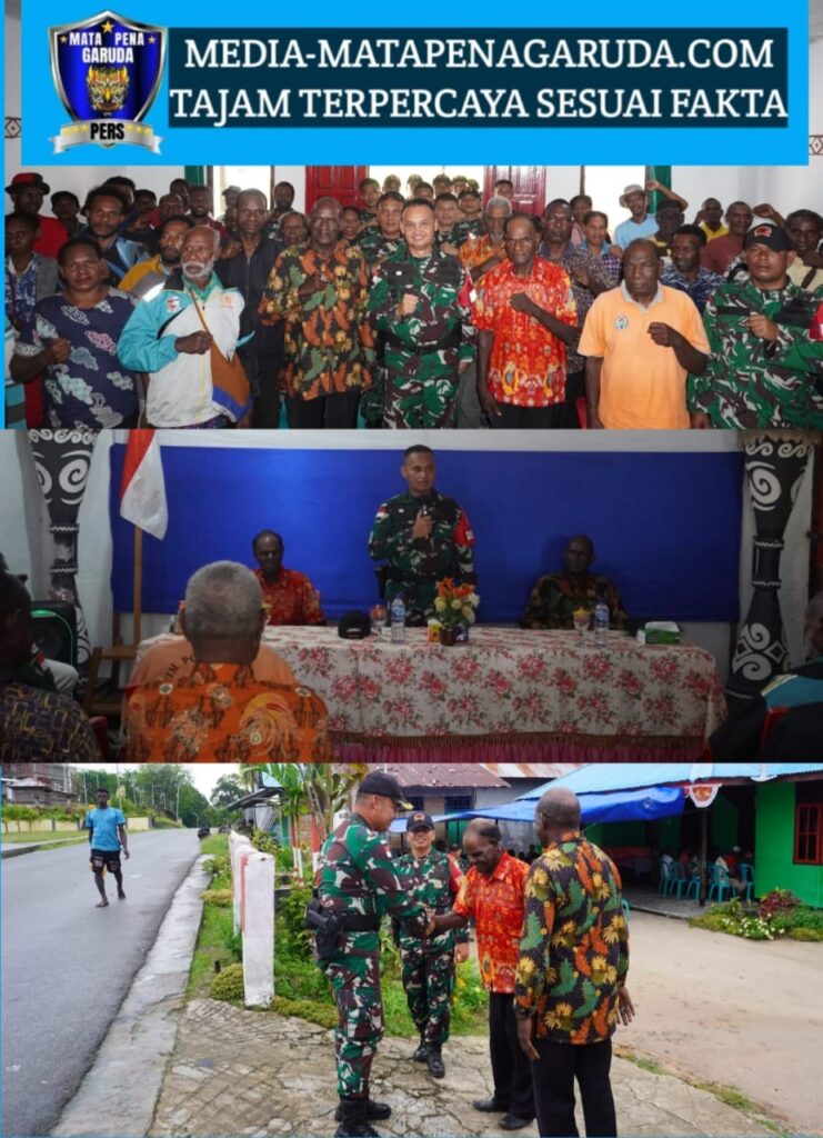 Dansatgas Yonif 123/Rajawali, Letkol Inf Anhar Agil Gunawan S.H., M.Han., bersama perwira dan personel satgas mengunjungi rumah dewan adat, berdialog dengan ketua adat, tujuh kepala suku, serta tokoh masyarakat. Mereka membahas aspirasi dan kebutuhan warga setempat.
