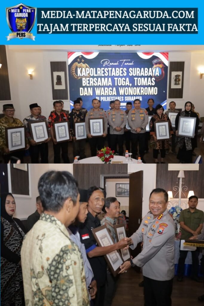 SURABAYA – Kapolrestabes Surabaya, Kombes Pol Luthfi Sulistiawan, memberikan penghargaan kepada Kapolsek Wonokromo Kompol Hegy R, bersama tokoh agama (Toga) dan tokoh masyarakat (Tomas) yang telah berperan besar menjaga keamanan Mapolsek Wonokromo saat terjadinya aksi kerusuhan beberapa waktu lalu.