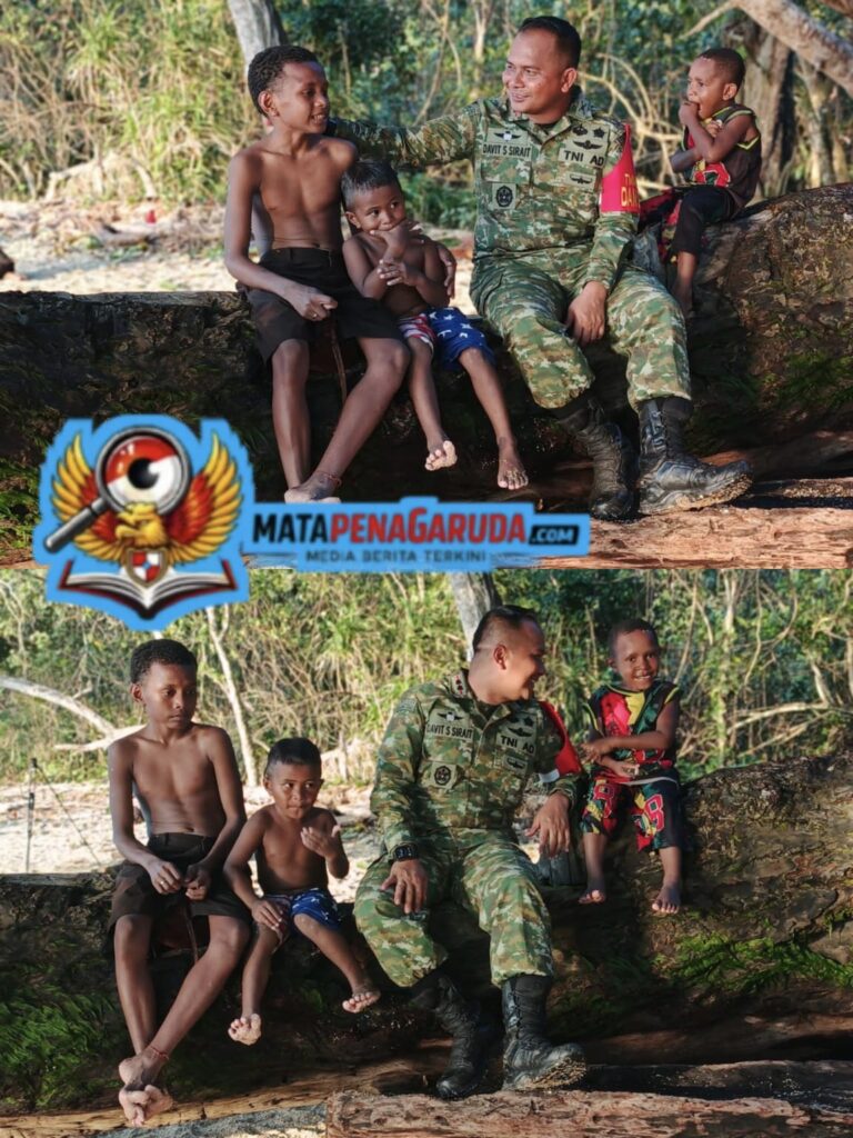 Di sela-sela kegiatan TMMD, Komandan Kodim 1801/Manokwari, Letkol Inf Davit Sutrisno Sirait, S.E., tampak meluangkan waktu berinteraksi langsung dengan anak-anak kampung. Dengan penuh canda dan kehangatan, Dandim duduk bersama anak-anak di atas batang kayu di pinggir pantai, menciptakan momen kebersamaan yang sederhana namun penuh makna.