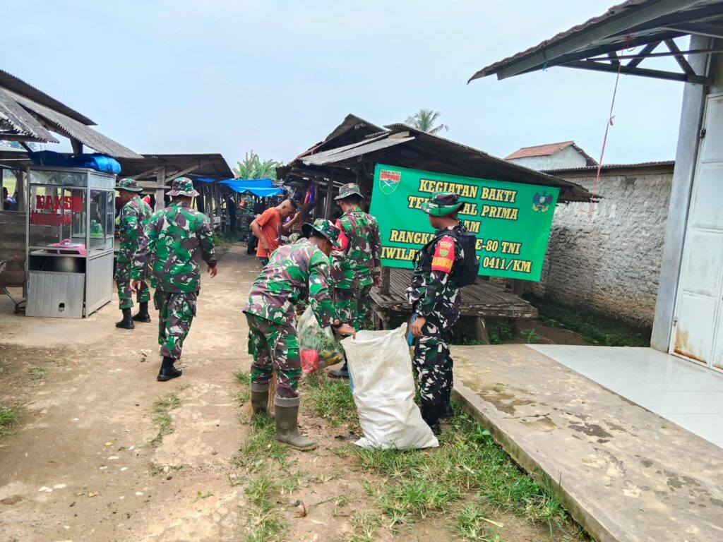 Manunggal TNI bersama Rakyat menggelar Karya Bakti TNI, untuk pembersihan Kali Apur KH 2 Kel Adipuro dan Pasar Tradisional Kel Simbarwaringin kec Trimurjo Kab Lampung Tengah.