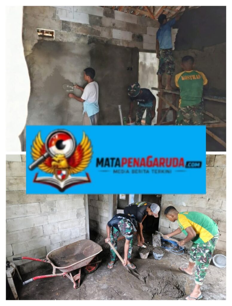 Prajurit dengan seragam kamuflase hijau-kuning khas TNI AD sedang membungkuk di depan gerobak dorong, sementara satu lagi mengayunkan cangkul untuk meratakan adukan semen di lantai. Dinding bata ekspos masih kasar, pintu kayu sederhana terbuka lebar, dan ember-ember berisi adukan berjejer di sekitar mereka. Bau tanah basah dan semen segar memenuhi udara.
