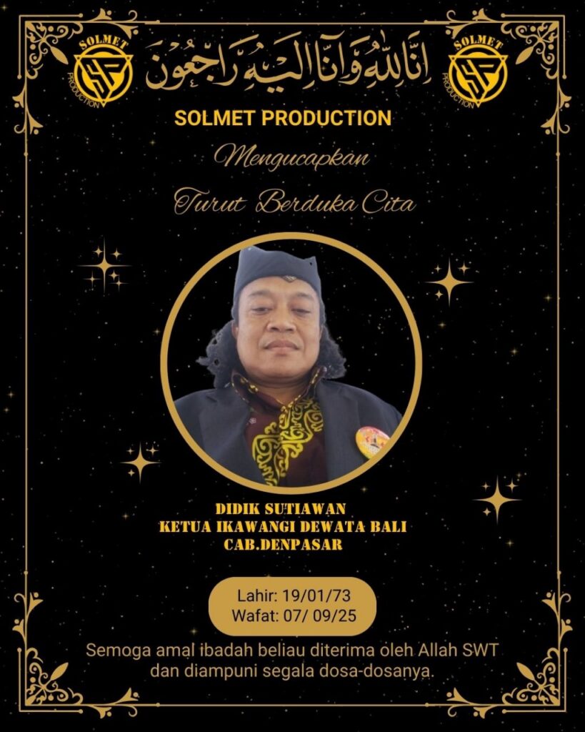 Keluarga besar Ikawangi Dewata Bali berduka, Bapak DIDIK SUTIAWAN meninggal dunia diusia 51 tahun, lahir 19/01/1973, wafat 07/09/2025, sa’at aktif menjabat sebagai ketua cabang Ikawangi Dewata Bali Denpasar.