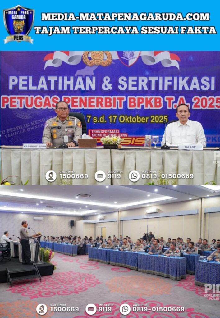 KORLANTAS POLRI, Jakarta — Kegiatan Sertifikasi Petugas Penerbit Buku Pemilik Kendaraan Bermotor (BPKB) Tahun Anggaran 2025 resmi dibuka pada Selasa (14/10/2025) di Cililitan, Jakarta. Pembukaan dilakukan langsung oleh Kasubdit BPKB Ditregident Korlantas Polri, Kombes Pol Sumardji. Kegiatan ini menjadi langkah strategis dalam mendukung transformasi digital layanan kepolisian, termasuk implementasi BPKB elektronik.