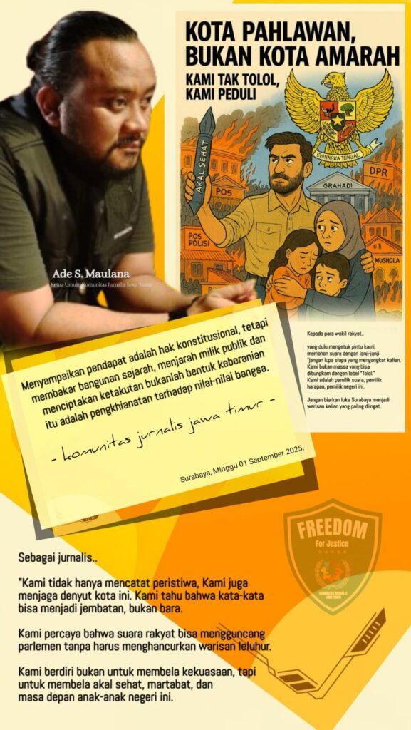 Sebagai jurnalis, kami tidak hanya mencatat peristiwa. Sebagai sembangsih kami kepada negeri, kami ikut menjaga denyut kota ini. Kami tahu bahwa kata-kata bisa menjadi jembatan, bukan bara. Kami percaya bahwa suara rakyat bisa mengguncang parlemen tanpa harus menghancurkan warisan leluhur. Kami berdiri bukan untuk membela kekuasaan, tapi untuk membela akal sehat, martabat, dan masa depan anak-anak negeri.