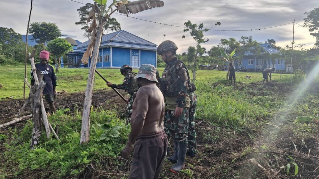 Personel Satgas Yinif 521/DY kembali menunjukkan kepedulian mereka terhadap kemandirian pangan masyarakat dengan membantu warga membuka dan menyiapkan kebun di lahan kosong milik kampung di Kobakma, Mamberamo Tengah, Papua Pegunungan (19/11/2025).