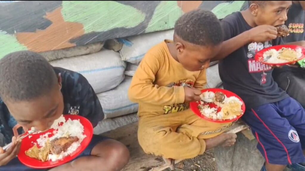 Yahukimo, –Suasana penuh kehangatan dan kekeluargaan tampak di Pos Kurima Satgas Yonif 521/DY ketika Personel Pos menggelar acara makan bersama dengan anak Papua di Distrik Kurima, Yahukimo, Papua Pegunungan. (2 November 2025).