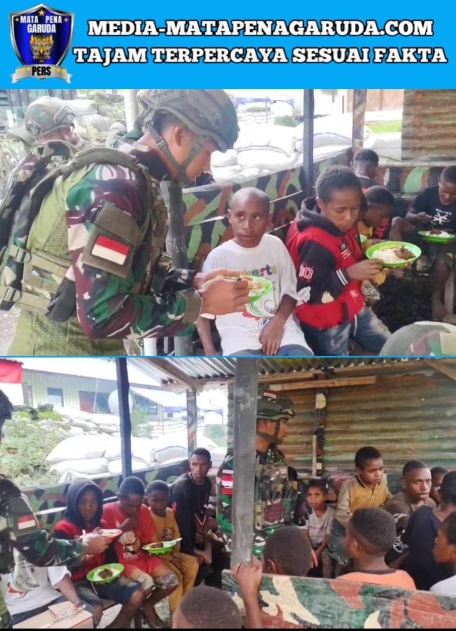 Yahukimo, –Suasana penuh kehangatan dan kekeluargaan tampak di Pos Kurima Satgas Yonif 521/DY ketika Personel Pos menggelar acara makan bersama dengan anak Papua di Distrik Kurima, Yahukimo, Papua Pegunungan. (2 November 2025).