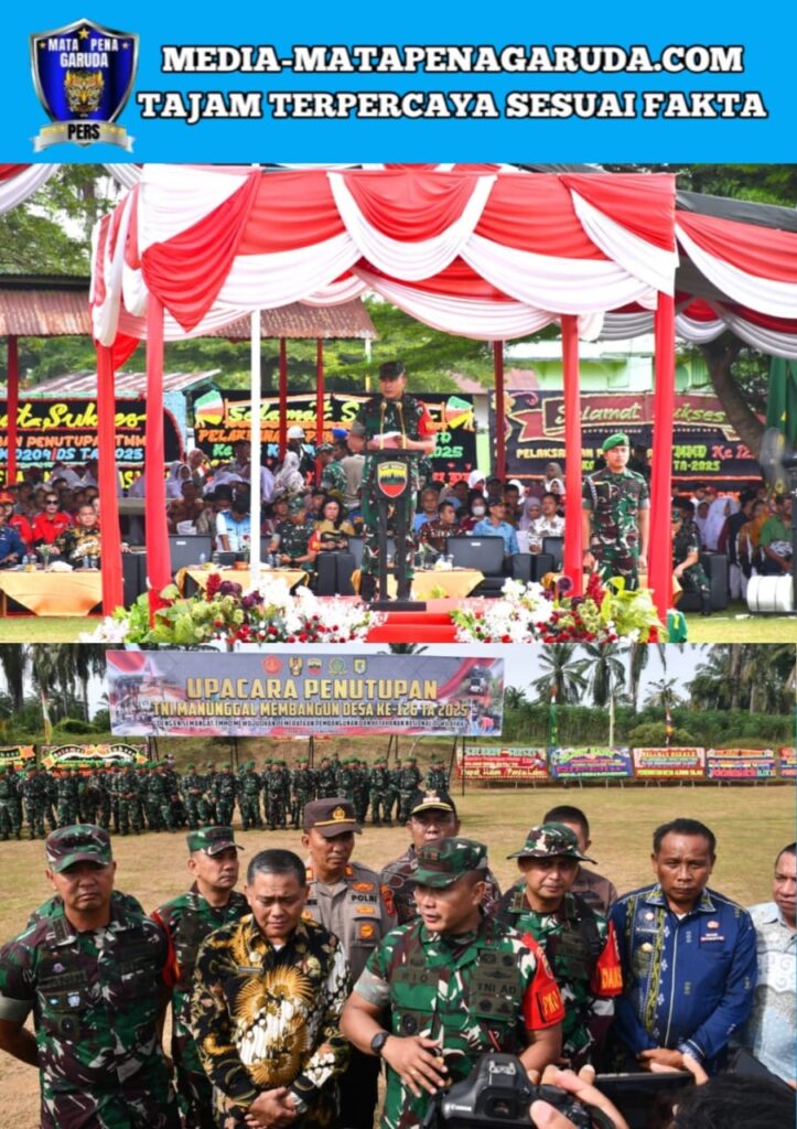 Serdang Bedagai – Pangdam I/Bukit Barisan Mayjen TNI Rio Firdianto memimpin upacara penutupan TNI Manunggal Membangun Desa (TMMD) ke-126 Tahun Anggaran 2025 di Lapangan Sepak Bola PT KHI, Desa Hevea, Kecamatan Dolok Masihul, Kabupaten Serdang Bedagai, Kamis (6/11/2025). Upacara di awali dengan pengalungan bunga dan tarian persembahan khas daerah.