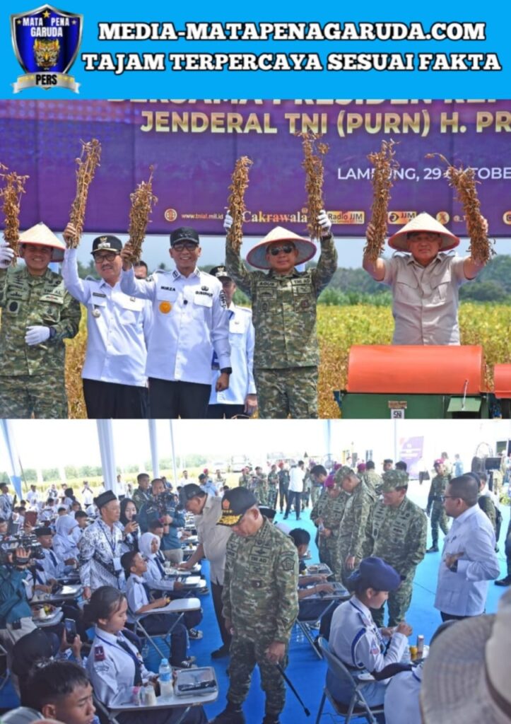 (Puspen TNI). Panglima TNI Jenderal TNI Agus Subiyanto bersama Kepala Staf TNI Angkatan Laut Laksamana TNI Muhammad Ali mendampingi Menteri Pertahanan Republik Indonesia Sjafrie Sjamsoeddin meninjau langsung hasil panen kedelai di lahan pertanian Komplek Pemukiman TNI AL (Kimal), Desa Madukoro, Kotabumi, Lampung Utara, Lampung, Rabu (29/10/2025). Kegiatan yang di hadiri pula oleh Menteri Pertanian RI ini, menjadi bukti nyata komitmen TNI dalam mendukung program prioritas Presiden Republik Indonesia Prabowo Subianto di bidang ketahanan pangan nasional.