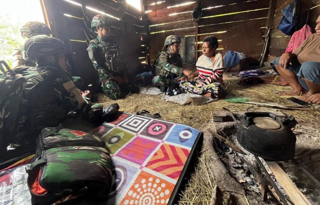 Distrik Kelila, —Personil Satgas Pamtas Kewilayahan Yonif 521/DY Pos Kelila melaksanakan memeriksa kesehatan warga yang sedang sakit secara gratis di Distrik Kelila, Mamberamo Tengah, Papua Pegunungan (10/12/2025).