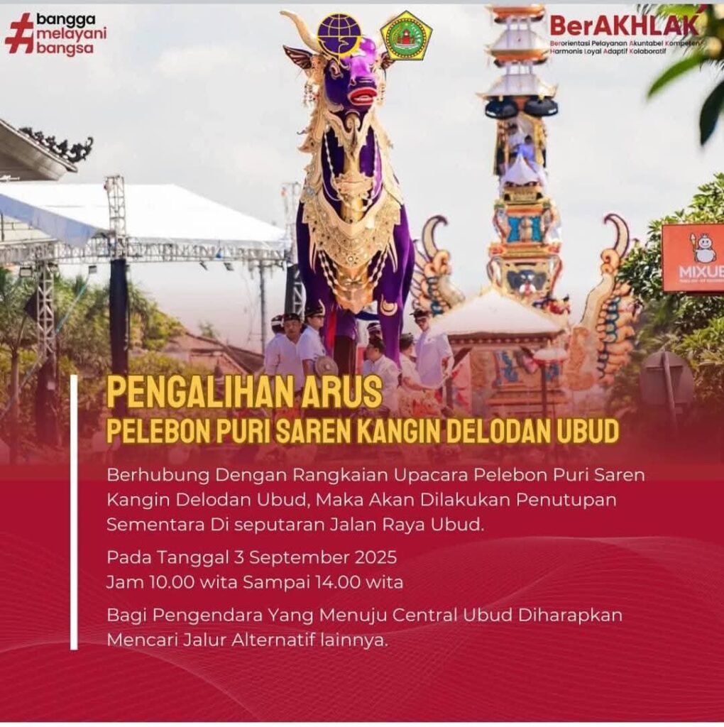 Gianyar,- Berhubung akan diadakan rangkaian upacara Pelebon Puri Saren Kangin Delodan Ubud, pada Rabu 03/09/2025. akan dilakukan penutupan jalan sementara.