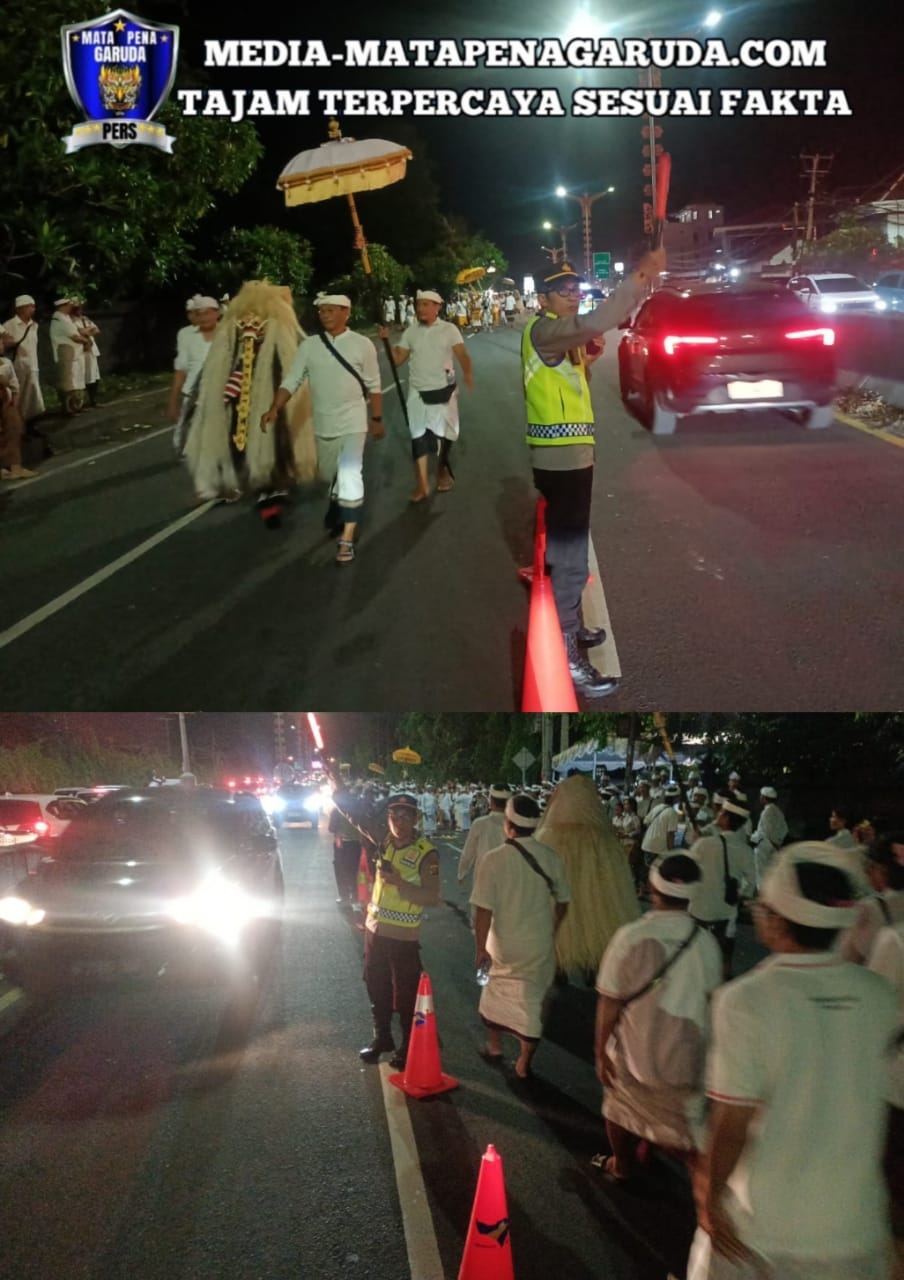 Personel gabungan melakukan pengaturan arus kendaraan, pemantauan di area pura, serta menjaga situasi tetap kondusif selama berlangsungnya prosesi upacara.