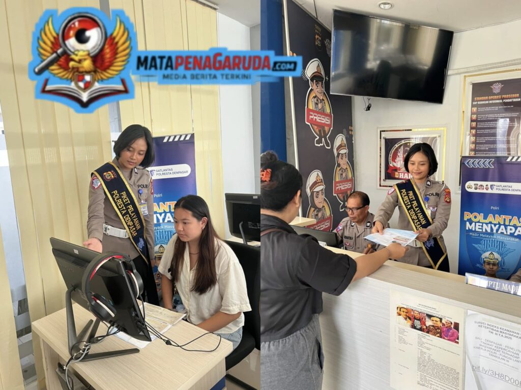 Denpasar,. – Wajah pelayanan publik yang ramah dan profesional kembali ditunjukkan oleh Satuan Lalu Lintas Polresta Denpasar melalui program “Polantas Menyapa”. Dalam suasana pelayanan yang tertib dan nyaman, petugas kepolisian tampak sigap membantu masyarakat yang mengurus administrasi lalu lintas, mulai dari penerbitan hingga konsultasi dokumen.