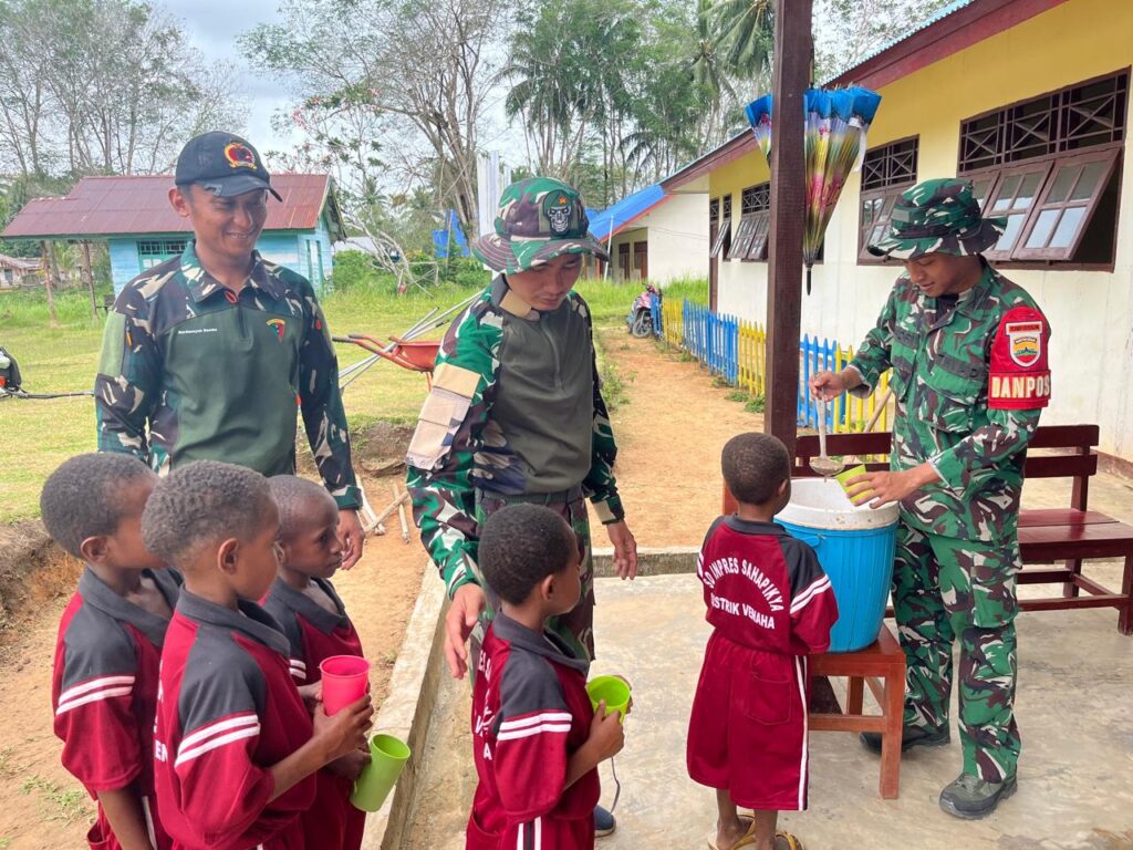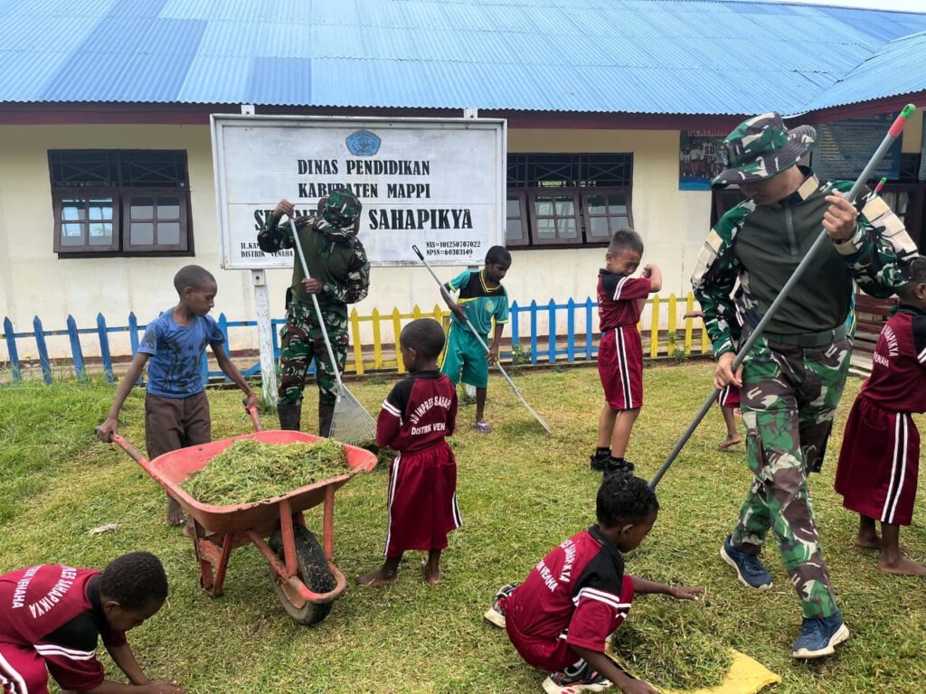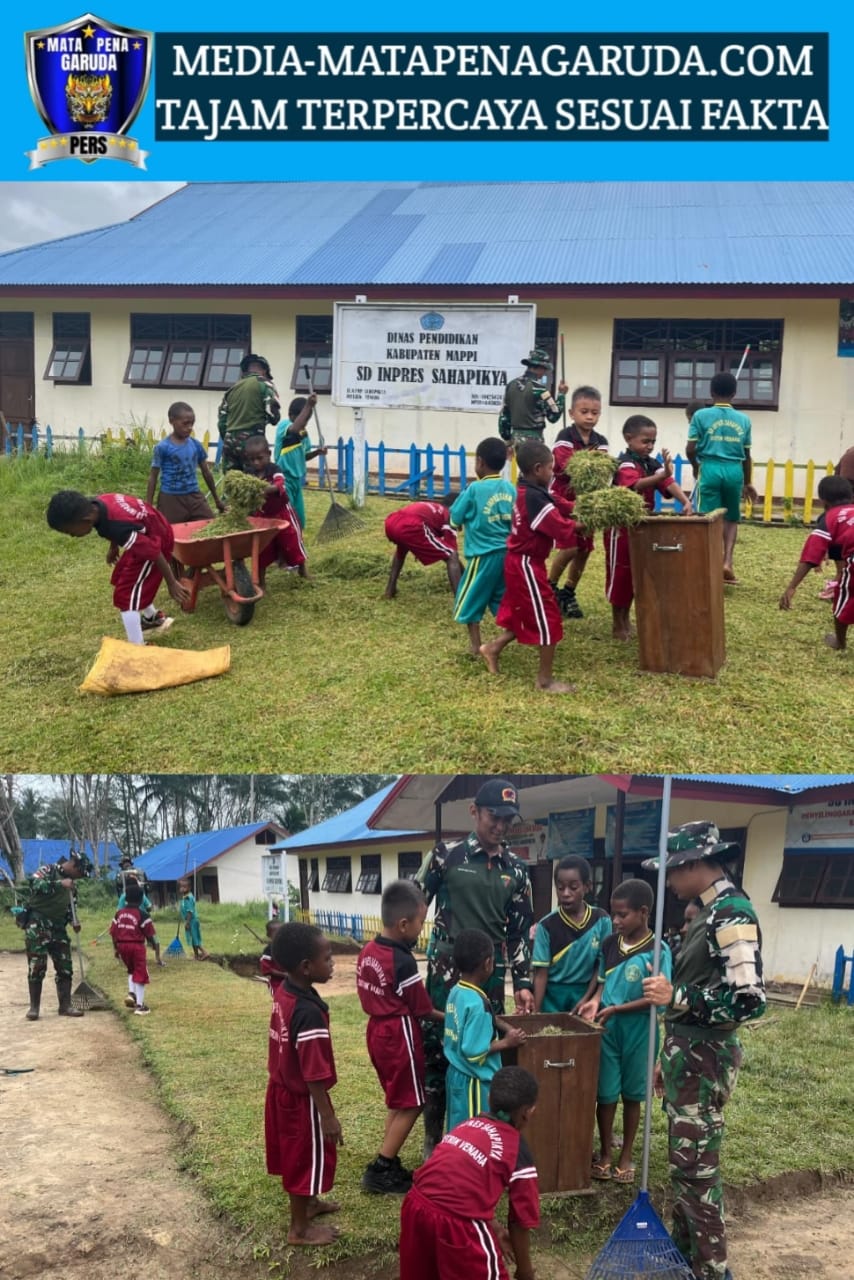 Venaha – Dalam rangka menjaga kebersihan lingkungan sekaligus menanamkan rasa peduli terhadap lingkungan sejak dini, Pos Venaha Satgas Yonif 123/Rajawali yang dipimpin oleh Danpos, Letda Inf Achmad Badri, melaksanakan kegiatan pembersihan lingkungan sekolah bersama anak-anak SD Inpres Sahapikya, Kampung Sahapikya, Distrik Venaha, Kabupaten Mappi, Papua Selatan, pada Rabu (10/9/2025).