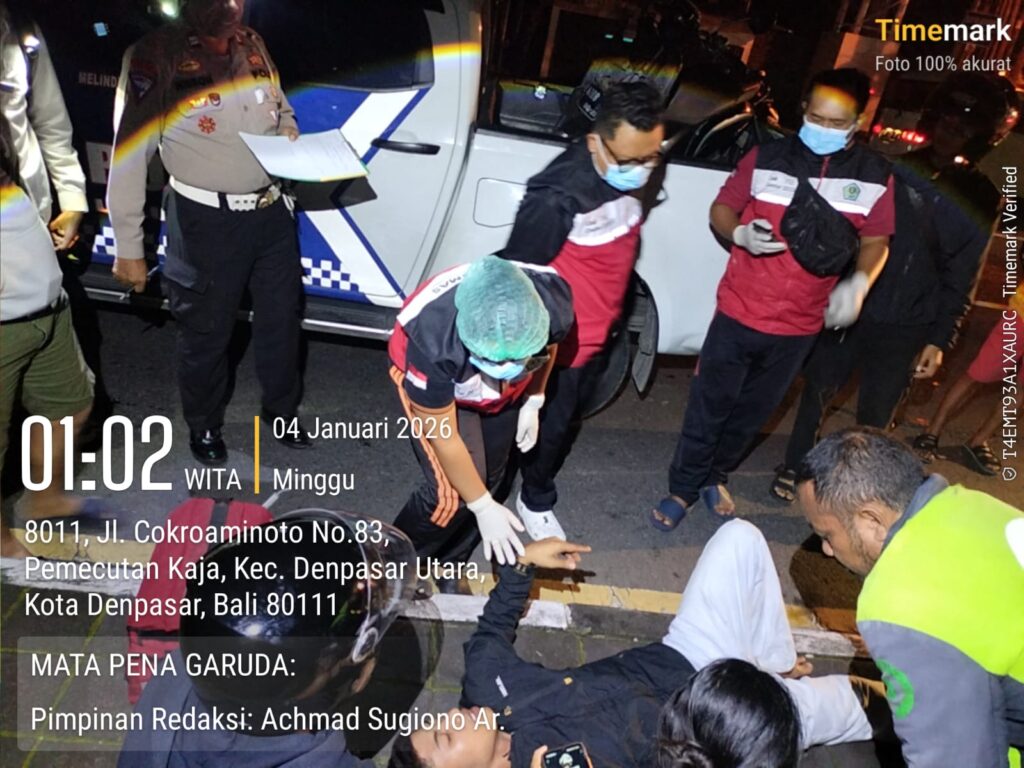 DENPASAR,.- Terjadi kecelakaan di Jl. Cokroaminoto, Tl Cokro Depan Dealer Honda, Sabtu malam minggu dini hari pukul 00:30 wita 04/01/2026.