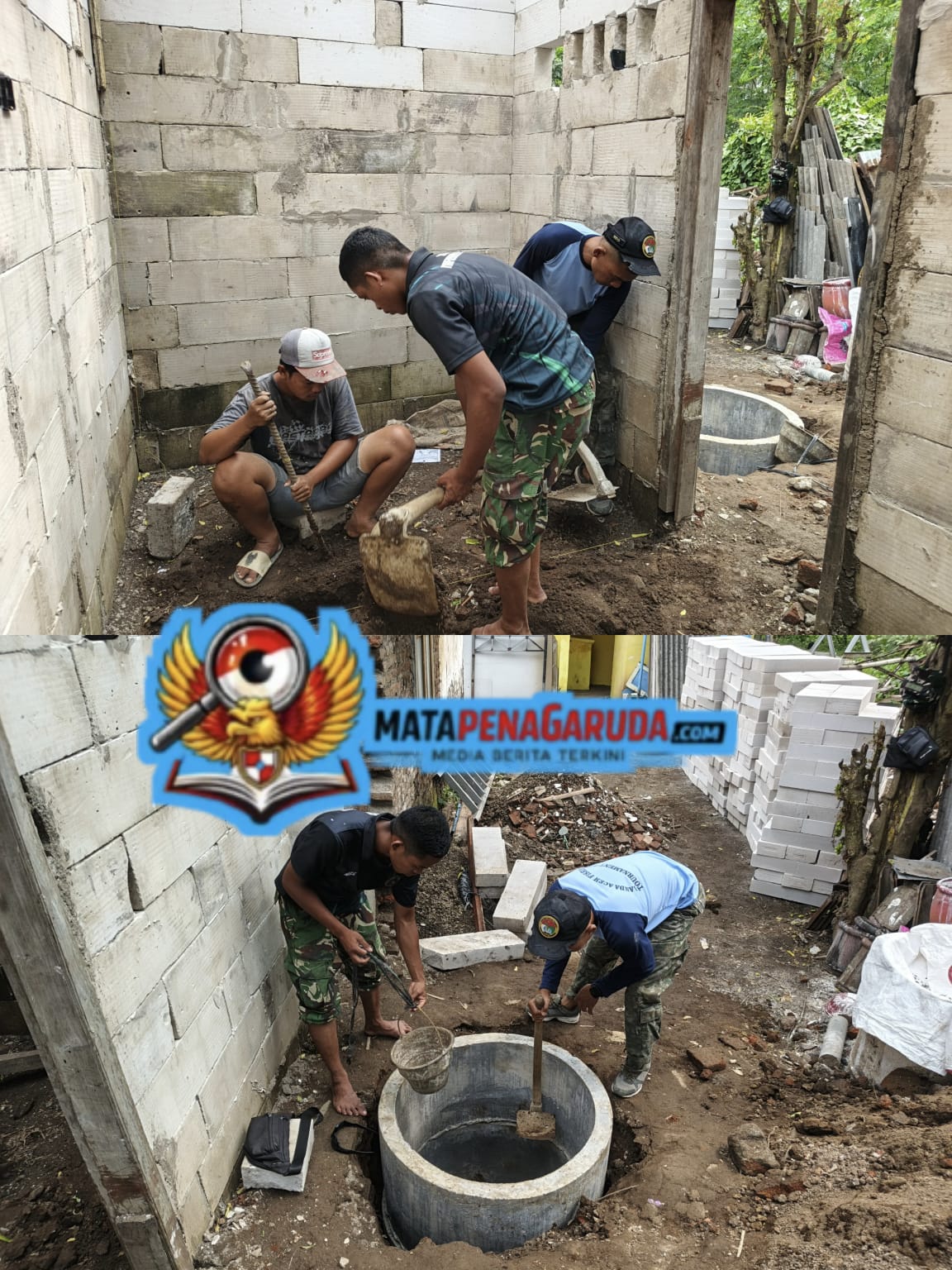 Di lokasi pembangunan, dua prajurit TNI terlihat bekerja di sekitar sumur beton. Seorang prajurit menuangkan air dari selang ke ember, sementara rekannya meratakan adukan semen di dasar lubang menggunakan cangkul. Tumpukan batu bata yang siap dipasang menjadi tanda bahwa pembangunan fasilitas sanitasi tersebut terus berjalan.