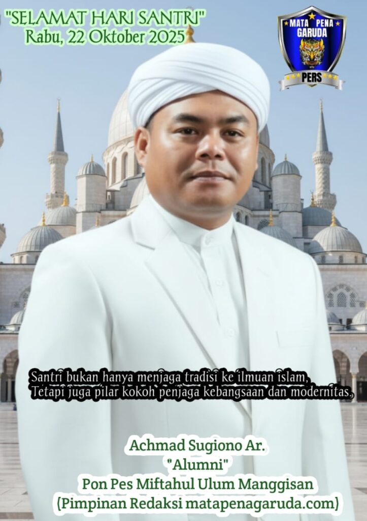 Assalamualaikum Warahmatullahi Wabarakatuh. Atas nama seluruh jajaran redaksi matapenagaruda.com, kami mengucapkan: “Selamat Hari Santri Nasional 22 Oktober 2025” Tema yang di usung dalam Hari Santri tahun ini adalah cerminan dari semangat yang tak pernah padam. Santri bukan hanya penjaga tradisi keilmuan Islam, tetapi juga pilar kokoh penjaga kebangsaan dan modernitas. Di tengah tantangan disrupsi teknologi dan kompleksitas global, peran santri semakin vital: Perekat Kebangsaan: Santri membuktikan bahwa Islam dan keindonesiaan adalah dua sisi mata uang yang tak terpisahkan.