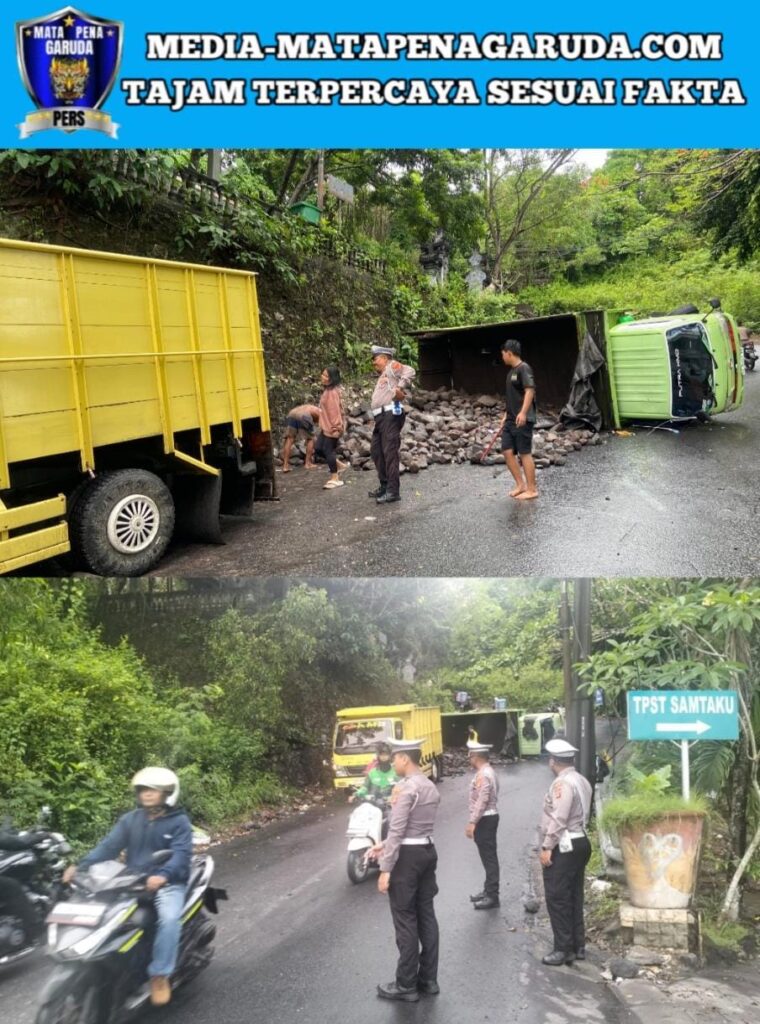 Badung, Bali – Sebuah truk bermuatan batu kali mengalami kecelakaan tunggal di tanjakan Pura Goa Gong, Jalan Goa Gong, Jimbaran, Kecamatan Kuta Selatan, pada Jumat (31/10/2025) dini hari sekitar pukul 04.30 Wita.