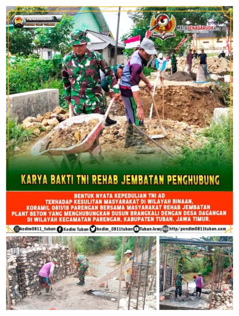 [ TUBAN ]– Bentuk nyata kepedulian TNI AD terhadap kesulitan masyarakat di wilayah binaan, Koramil 0811/18 Parengan bersama masyarakat rehab jembatan plant beton yang menghubungkan dusun Brangkali dengan desa Dagangan Kecamatan Parengan, Kabupaten Tuban, Jawa Timur. Kamis, (26/02/2026).